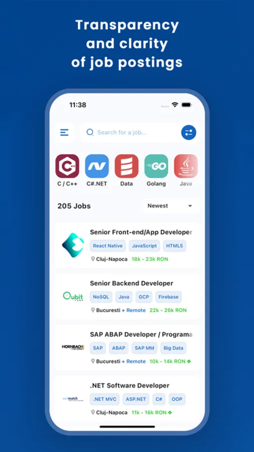 Access a wide range of job postings from across Romania, all organized in a user-friendly interface. Explore opportunities that match your salary expectations, preferred technologies, and desired locations. Say goodbye to searching through multiple websites — we've got everything you need!
