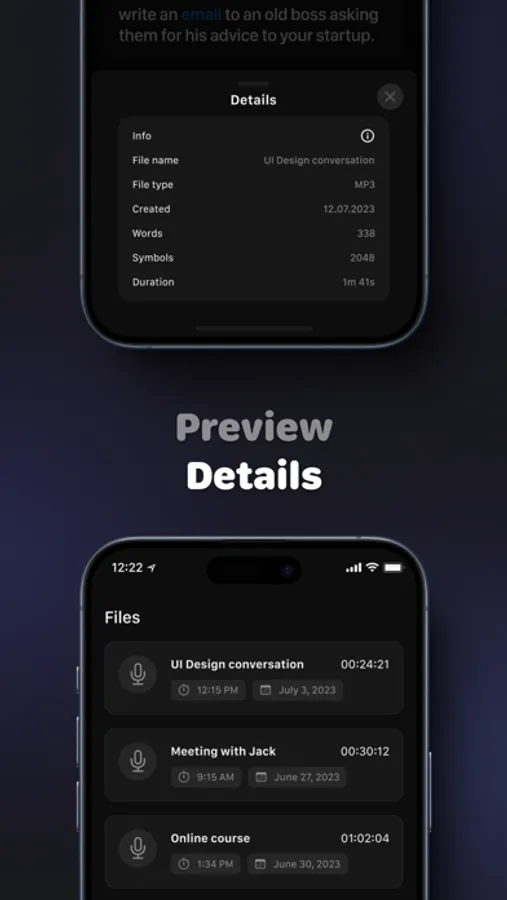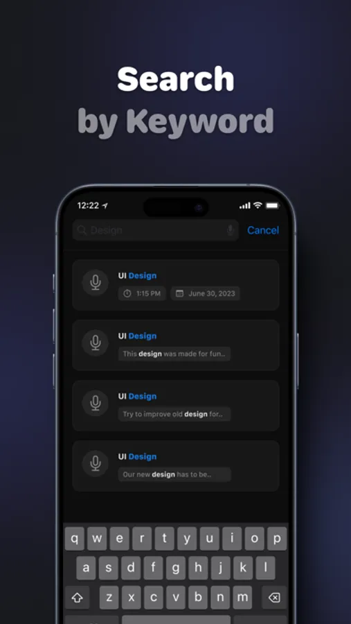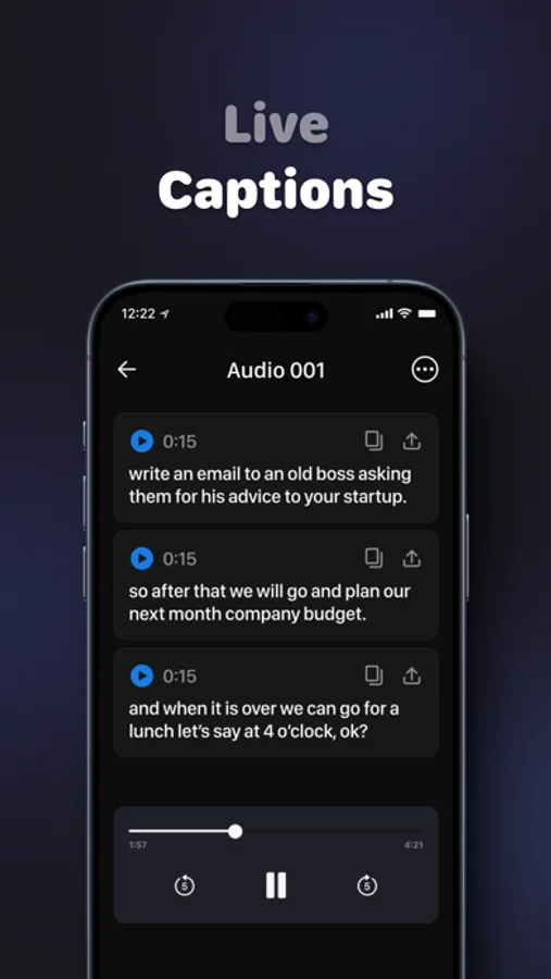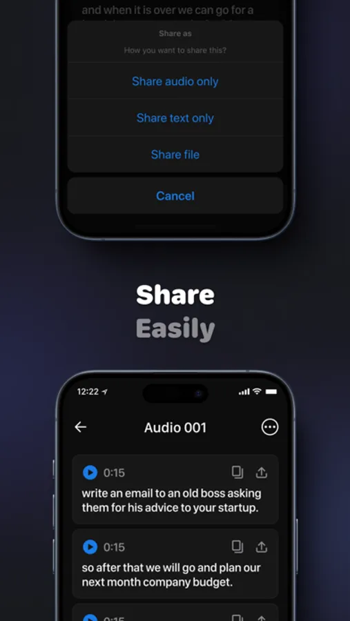 Organize and search audio instantly. Find words or phrases inside your transcripts, copy or share exactly what you need - no extra clutter.