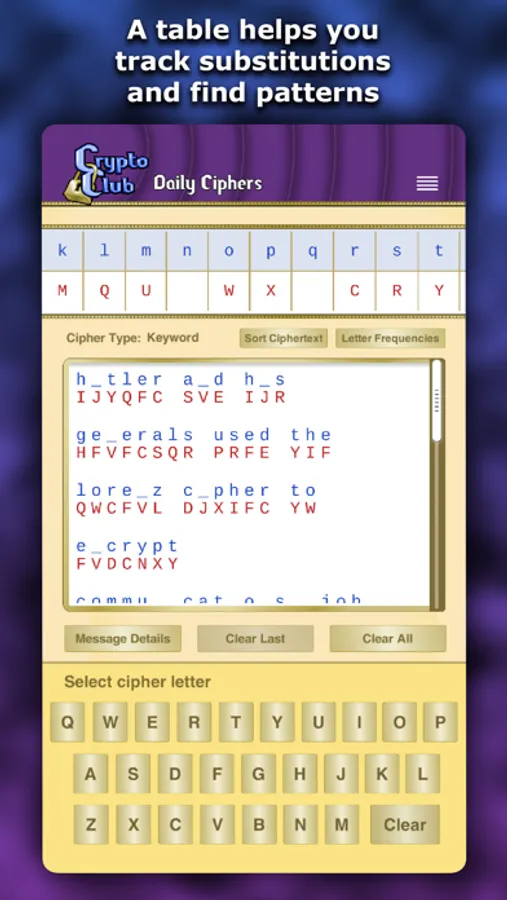 Don’t know what these ciphers are? No problem! The app has descriptions and examples of the patterns involved. It also has tools such as frequency tables that can help you guess letters, along with cipher tables to help you keep track of your guesses and look for patterns.
