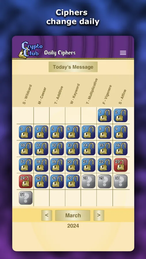 All released messages are available through the app’s calendar. Every day of the week except Sunday has its own cipher type: Caesar, Additive, Keyword, Multiplicative, Vigenère, or Affine. The ciphers generally get more complicated as the week goes on. Sunday’s message is a wildcard that could use any of those cipher types.