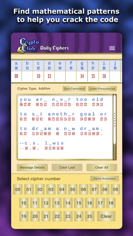 Each day a new encrypted message is released. Messages include anecdotes about the history of cryptography, fun facts about science, and inspirational quotes. See how many days in a row you can successfully crack a message!