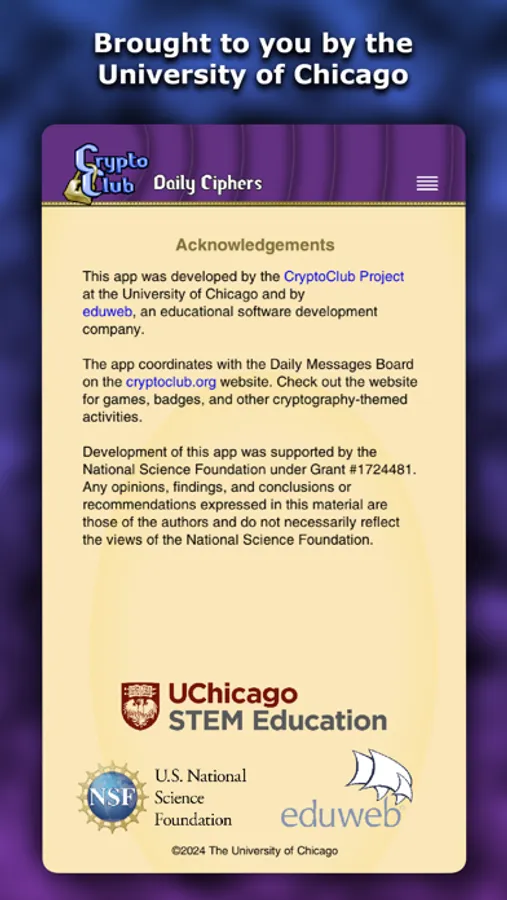CryptoClub Daily Ciphers is a companion app to the Daily Messages portion of the cryptoclub.org website. Check out the website for games, badges, and other activities that involve secret codes.