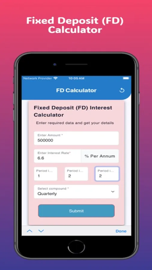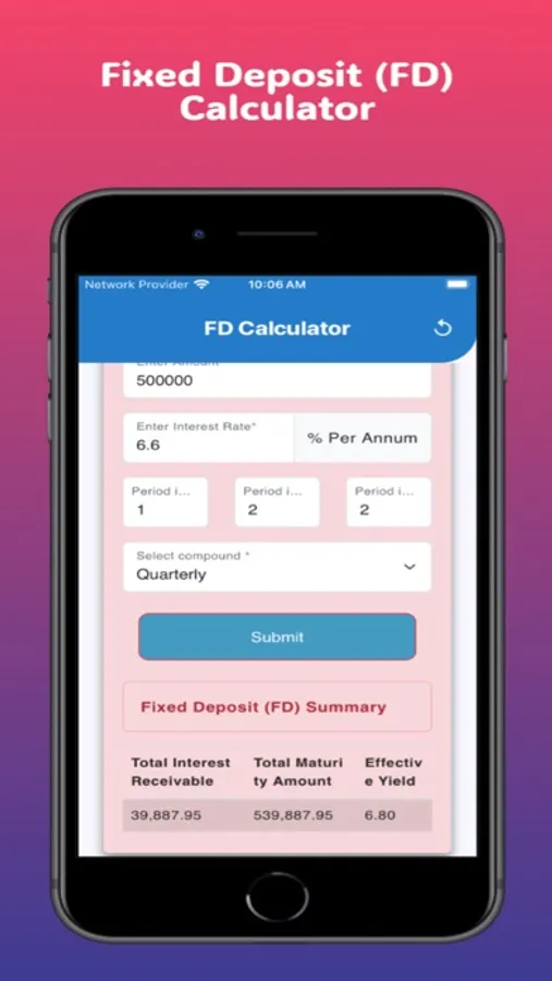 Welcome to our app, where financial planning meets convenience. With our user-friendly interface, you can effortlessly calculate your fixed deposit returns with interest compounded quarterly.