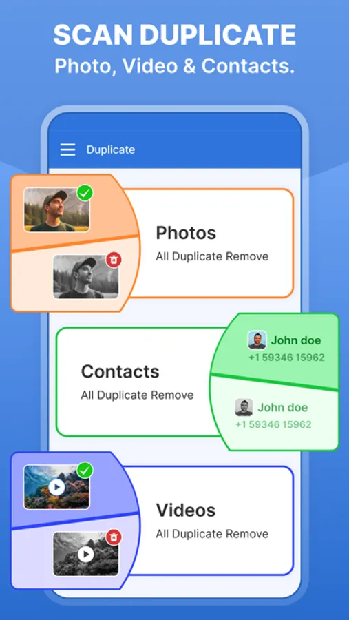 Advanced Scanning Technology: Our app employs cutting-edge algorithms to scan your device thoroughly, identifying duplicate photos, videos, and contacts with precision.