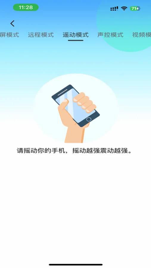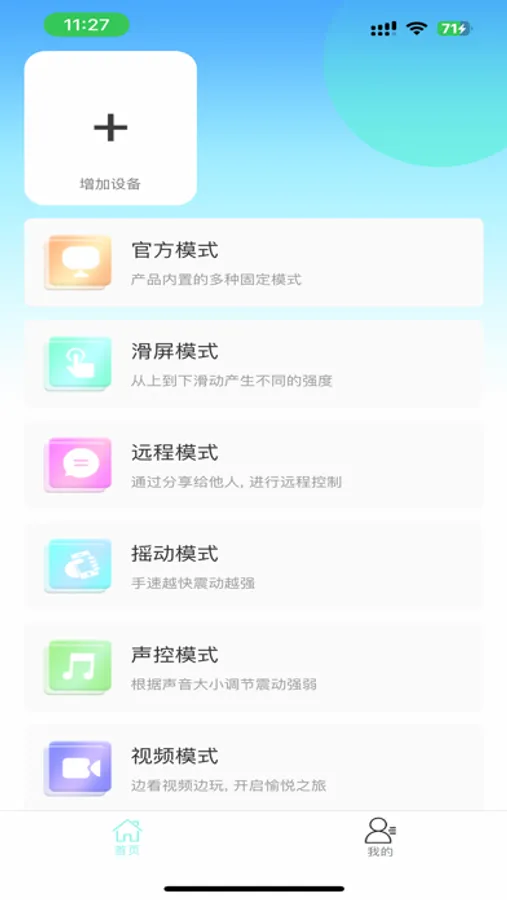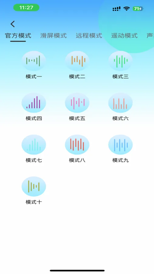 首页主要功能有官方模式、滑屏模式、远程模式、摇动模式、音乐模式、视频模式等模式可以控制设备