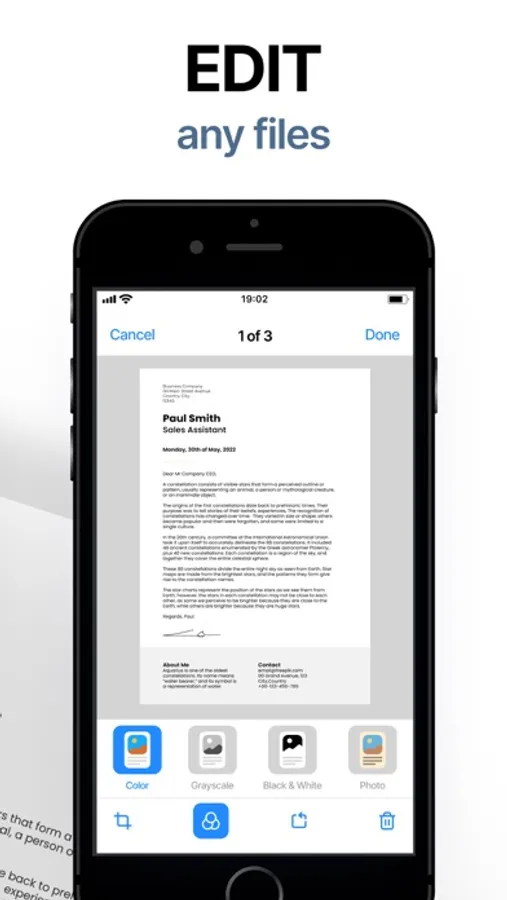 • Scanner app turns mobile to document scanner and file converter.