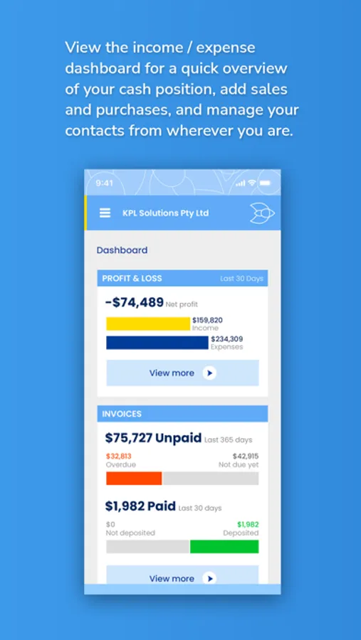 View the income/expense dashboard for a quick overview of your cash position, add sales and purchases, and manage your contacts from wherever you are.
