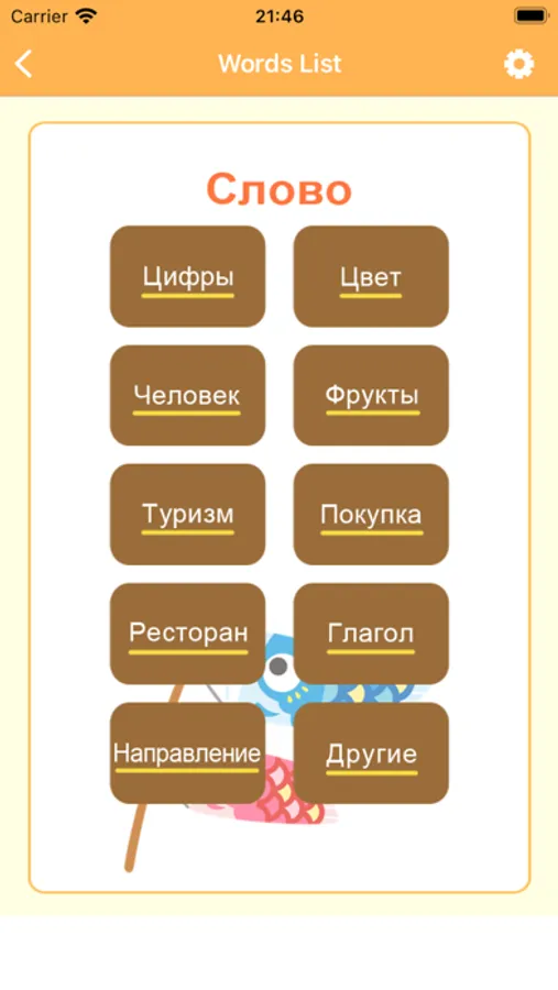 Основной контент включает в себя лексику, персонажей и мини-тесты.