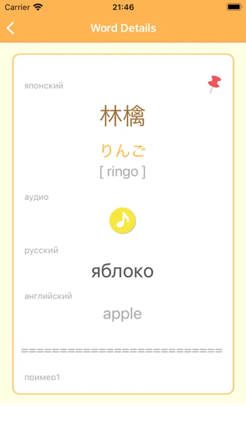 Каждое слово включает в себя два предложения-примера. Также есть английский перевод.