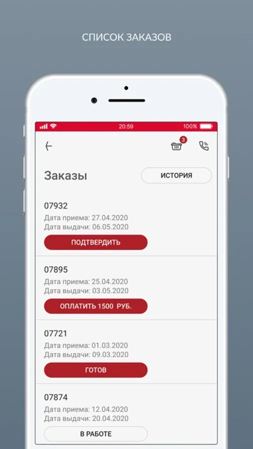 - посмотреть свои заказы: в работе, их статусы, историю заказов;