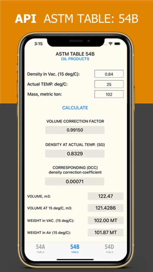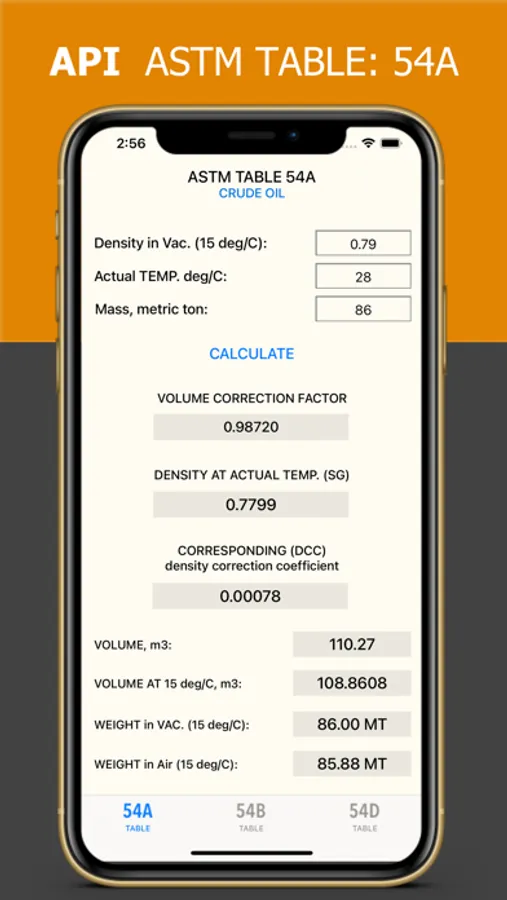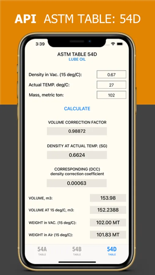 Welcome to ASTM Tables app - your ultimate tool for convenient calculation using ASTM Tables 54A, 54B, and 54D. Whether you're an engineer, scientist, or student, this app provides you with quick and accurate calculations right at your fingertips.