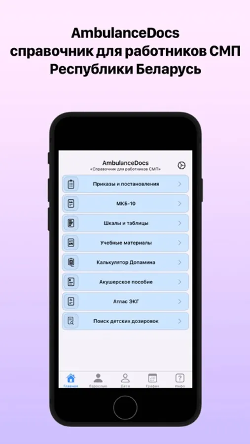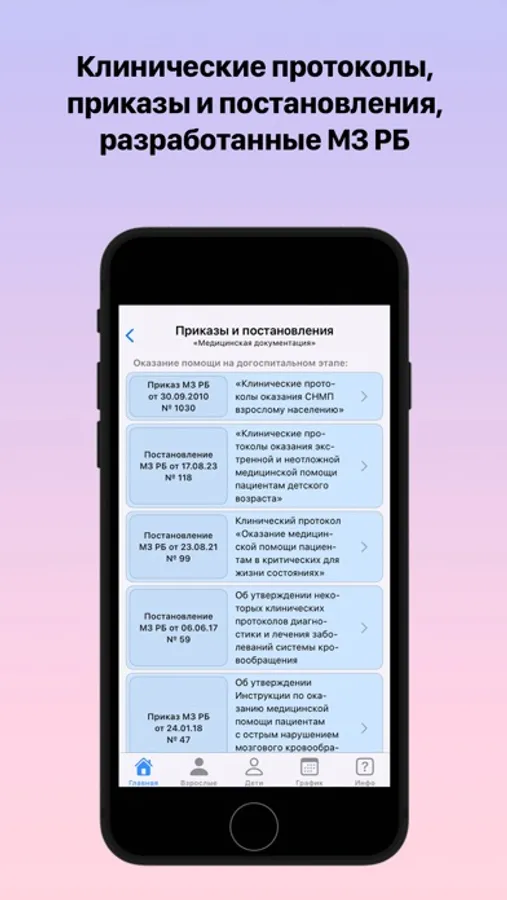 - Приказы и Постановления - содержит основные медицинские документы, разработанные МЗ РБ. Представлены в удобной для восприятия форме (в форме алгоритмов, выделена важная информация);