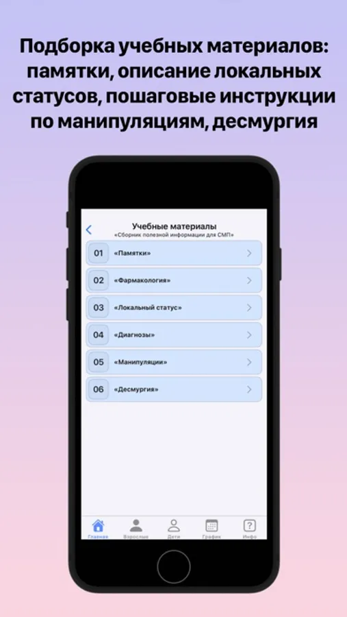 - Учебные материалы - содержит множество памяток, описаний локальных статусов, примеров написания диагнозов, подробных инструкций к манипуляциям, атлас десмургия в картинках;