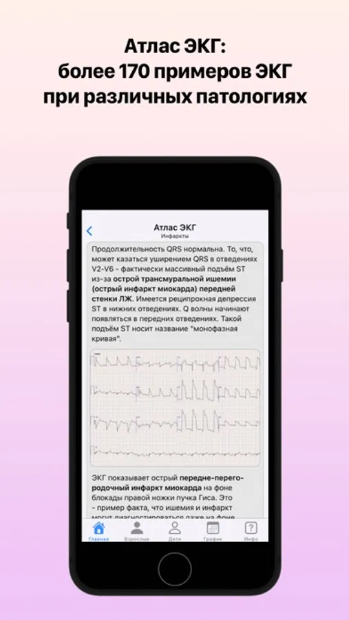- Атлас ЭКГ - более 170 примеров ЭКГ при различных патологиях. Так же содержит инструкцию по анализу ЭКГ;