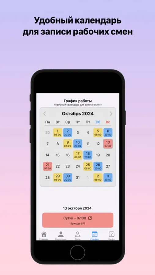- Календарь для записи рабочих смен - записывайте Ваши смены, чтобы не запутаться в графике работы.
