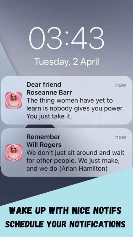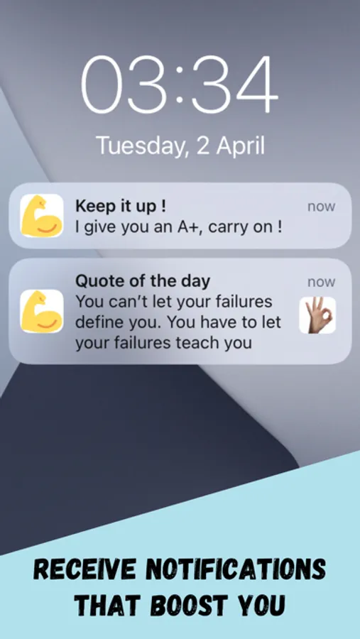 With Good Vibes Notifications, you won't be disturbed at a bad time. You will receive a notification scheduled by you at the time you want to receive a notification to boost you or remind you of the goals you have set for yourself.