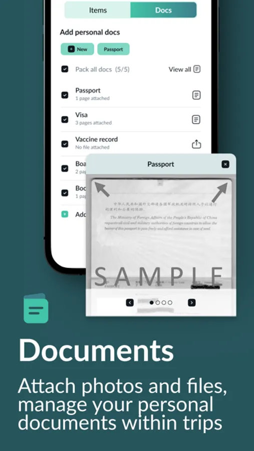 Add and manage documents such as passport, flight ticket, hotel confirmations and more. Keep everything under control for your travels.