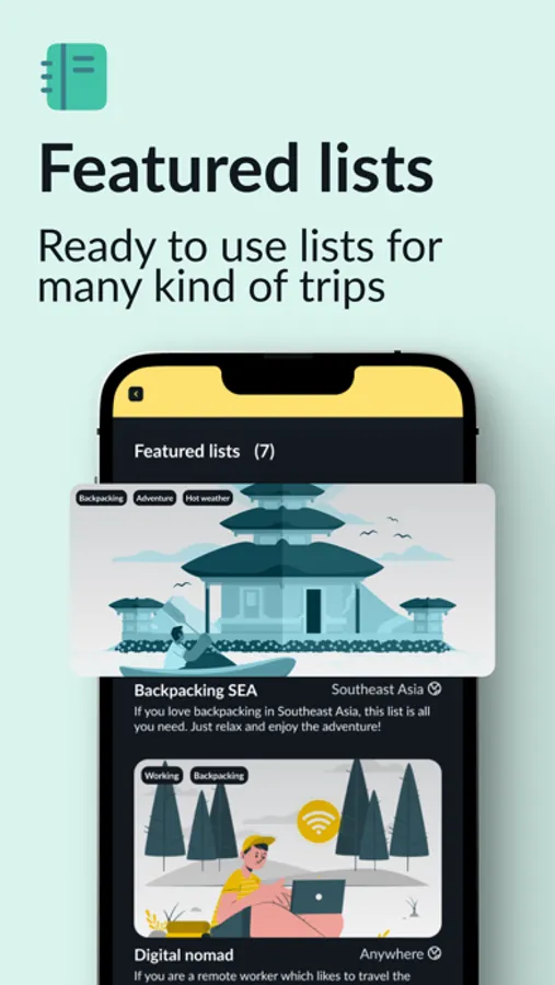 Features list are ready to use packing checklists. Choose your fav and customize them with your own kits and items.