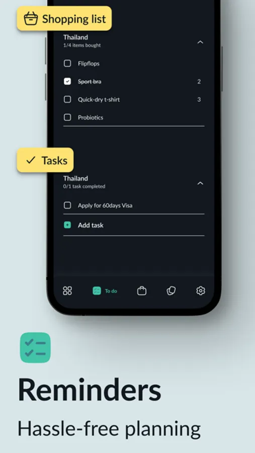 Manage shopping lists and tasks for seamless trip preparation. Set reminders for hassle-free planning.