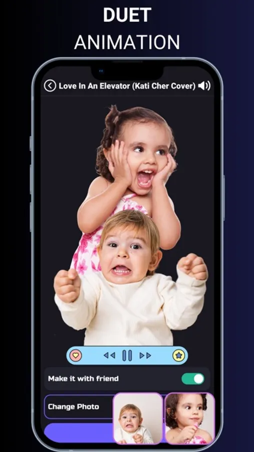 • Duet with Friends: Choose a template, upload two photos, and instantly create a split-screen video with you and your friend singing or talking together!