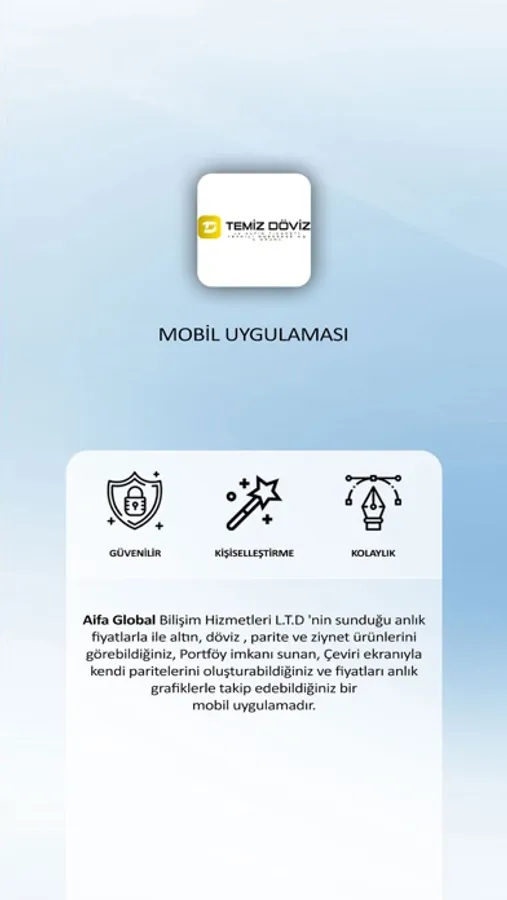 Aifa Global Informatics Services is a mobile application where you can see gold, currency, parity and jewelry products with instant prices offered by L.T.D, offer portfolio opportunity, create your own parity with Translation screen and monitor prices with instant graphics.
