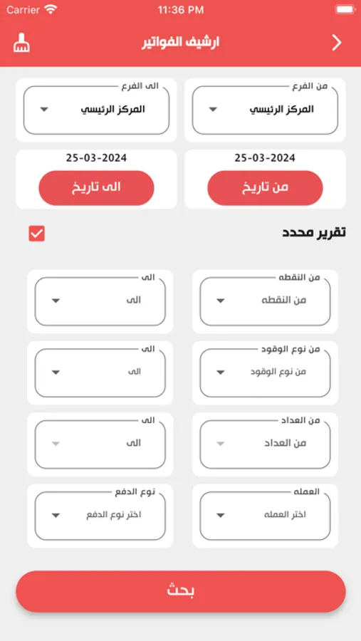 5-ترحيل (تحرير) مبيعات العدادات للموظفين بأنواعها المختلفة (نقد – اجل – كوبونات - شبكه)، حسب الفرع والنقطة والوردية، مع تحديد الكمية المباعة من كل عداد، والمبالغ النقدية المتحصلة من قبل الموظفين وتحديد الفائض والعجز.