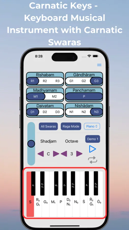 Carnatic Keys helps enthusiasts of Indian Classical Music have fun playing and expressing themselves using Carnatic Swaras and notations. Additionally it acts as a Raga guide. It helps to bridge the divide between Carnatic and Western notations and concepts. Users now have a tool that lets them express themselves using Carnatic vocabulary. Hindustani Music lovers can also benefit from this app because there is a lot of commonality between the two systems!