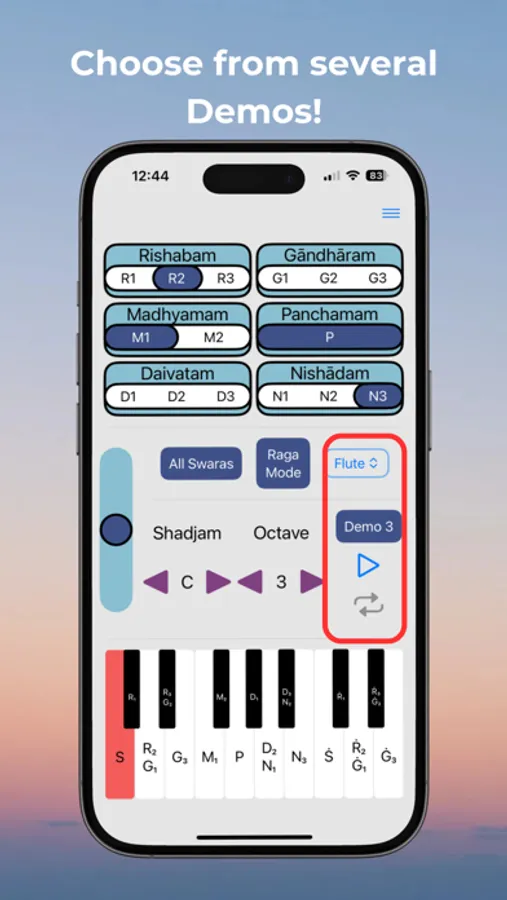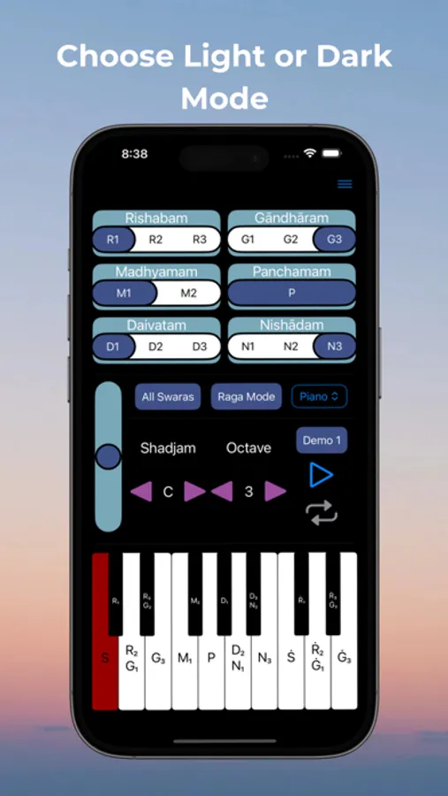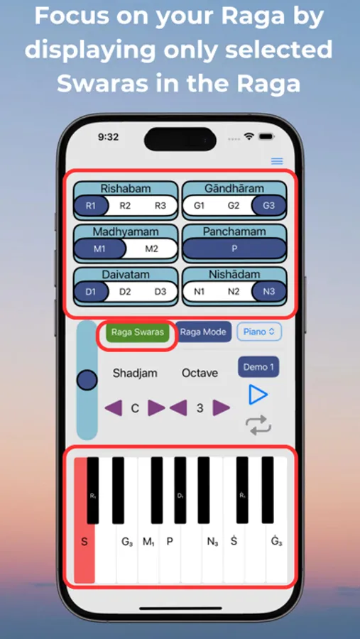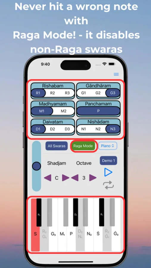 Using the Swara Selector, you can select Swara variations of the Raga you would like to play. The Keyboard Display selector toggles between various display modes - showing all Swaras, the selected Raga Swaras, or Western notes. This will help you focus on the Raga at hand by removing other Swaras from your focus. You can further disable all non-Raga keys by toggling the Raga Mode button. You can now avoid hitting the wrong keys and stay in tune!