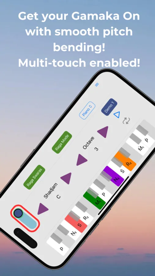 Carnatic Keys also supports the concept of Gamaka or ornamentation. Gamakas involve graceful and smooth variations in the pitch of a note, using oscillations or glides between notes to add emphasis and character to each Raga’s individuality. A smooth pitch wheel allows for seamless Gamakas, up or down 5 semitones or more! Getting good Gamaka takes a lot of practice, so feel free to skip Gamakas and any pitch-bending as you start out, and slowly start to experiment with them!