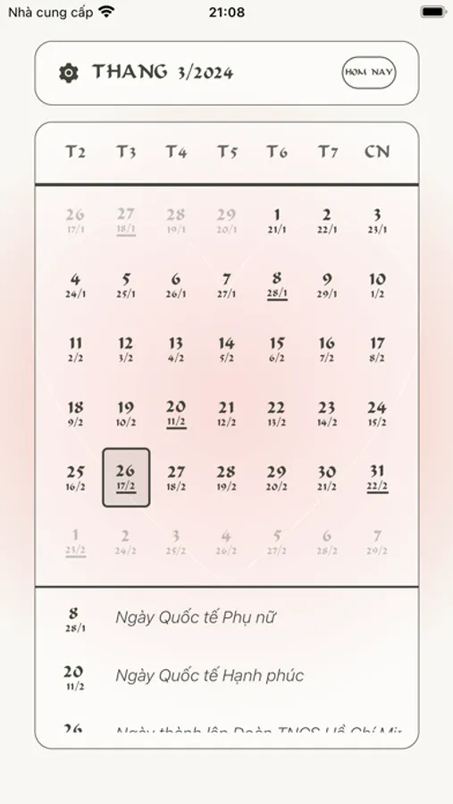 - Giao Diện Đẹp và Đơn Giản: Với thiết kế giao diện đẹp mắt và đơn giản, trải nghiệm sử dụng ứng dụng lịch âm trở nên dễ dàng và thú vị hơn bao giờ hết.