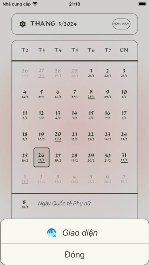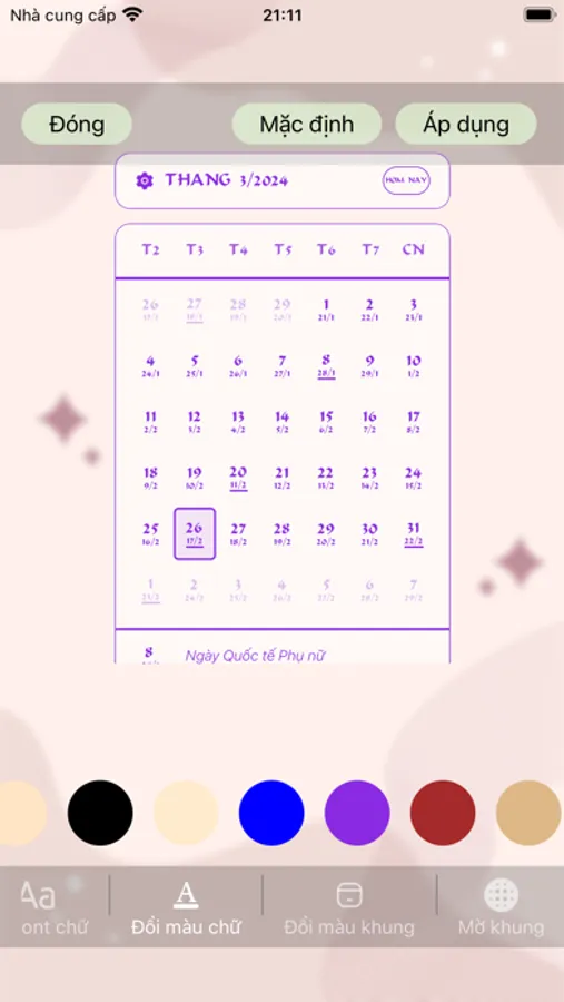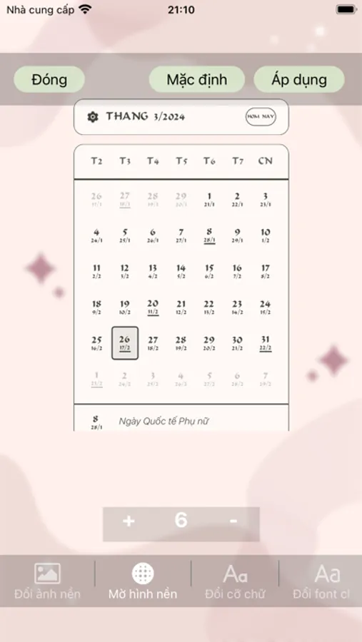 - Tùy Chỉnh Hình Nền, Cỡ Chữ, Phong Chữ và Màu Chữ: Tận hưởng sự linh hoạt của âm lịch Việt Nam với khả năng tùy chỉnh hình nền theo sở thích cá nhân. Bạn cũng có thể điều chỉnh cỡ chữ, phong cách chữ và màu chữ để ứng dụng thể hiện phong cách riêng của bạn.