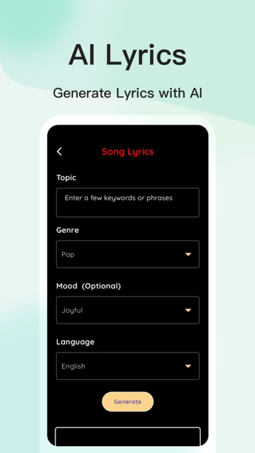 Smart Lyric Creation: Based on your theme and mood, AI Song can generate matching lyrics, completing your song.