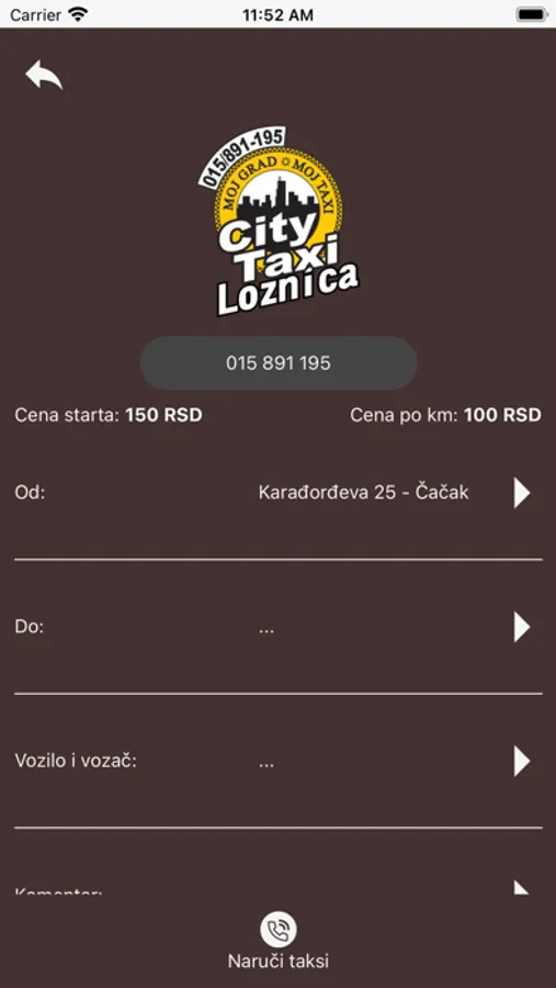 Aplikacija omogućuje naručivanje najbližeg taksi vozila uz mogućnost pregleda cene vožnje pre potvrde narudžbe. Program radi na Engleskoim i Srpskom jeziku.