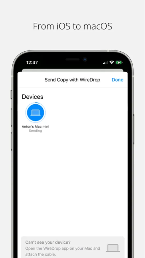 WireDrop will appear as a standard sharing option for Photos, Videos, and other file types. As long as you have the companion app active on your Mac, and USB cable connected, you will be able to transfer the files. Files are automatically saved to your Mac's Downloads folder.