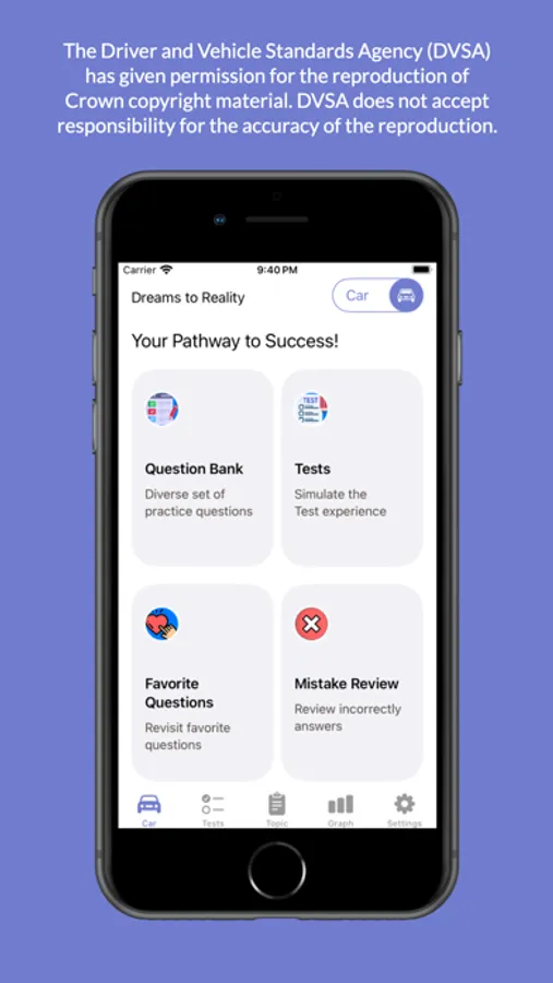 Pass your UK driving theory test faster with AI-powered personalised learning. Practice with official DVSA revision questions and realistic mock exams for cars, motorbikes, LGVs, and ADIs.