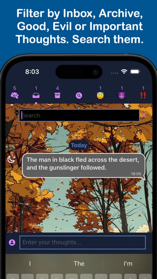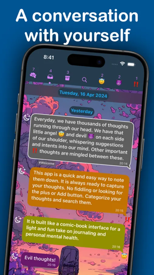 At any given moment, we have three thousand thoughts running through our minds. How can we capture these internal dialogues? Which thoughts should we hold onto and follow through? We need to identify and address the negative thoughts. "Thousand Thoughts" acts as a personal brain dump, always prepared to receive your input as soon as you open the app.