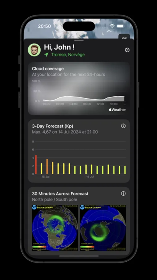 - Interactive Map: View multiple layers including cloud coverage, one-hour aurora forecasts, and combined views.