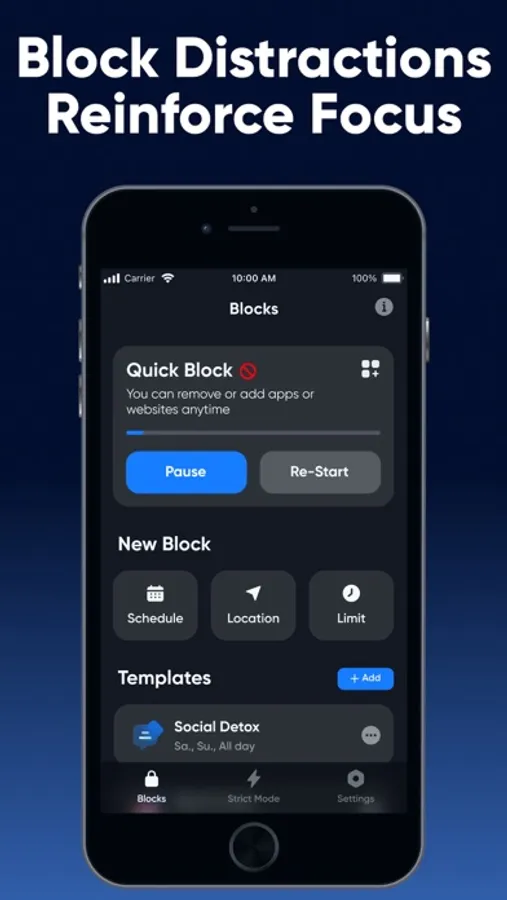 Are you tired of constant distractions affecting your productivity and concentration? Take control of your time with the App and Website Blocker and stay active without any interruptions. Unlimited blocking lists, scheduled blocking, location restrictions and strict mode all enhance your productivity. Set up specific times or days for blocking apps and websites to align with your daily routine. Say goodbye to app distractions with just one tap. Experience the freedom of focused work!