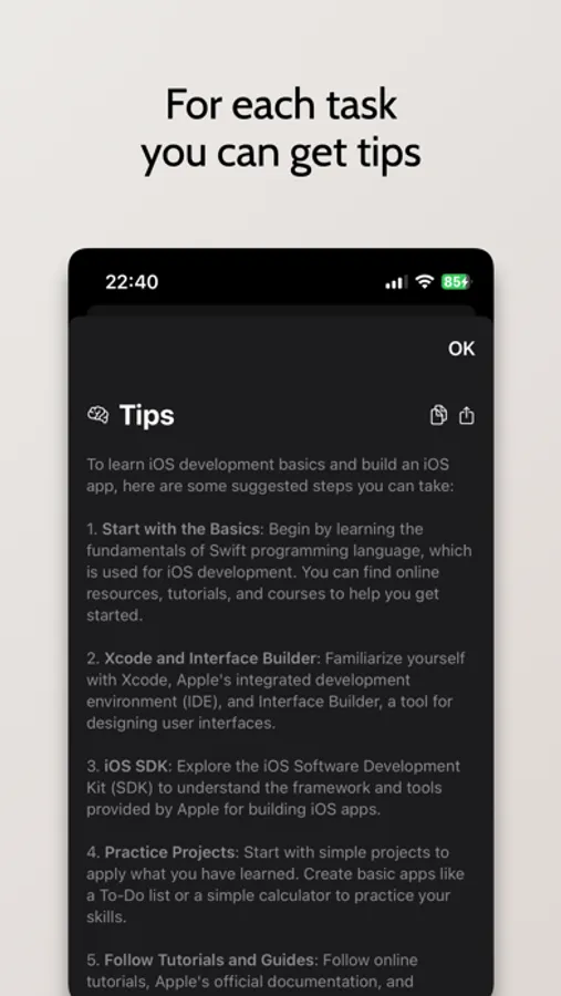 • Tasks are broken down with maximum clarity — and the first step is always easy, so you can start right away.