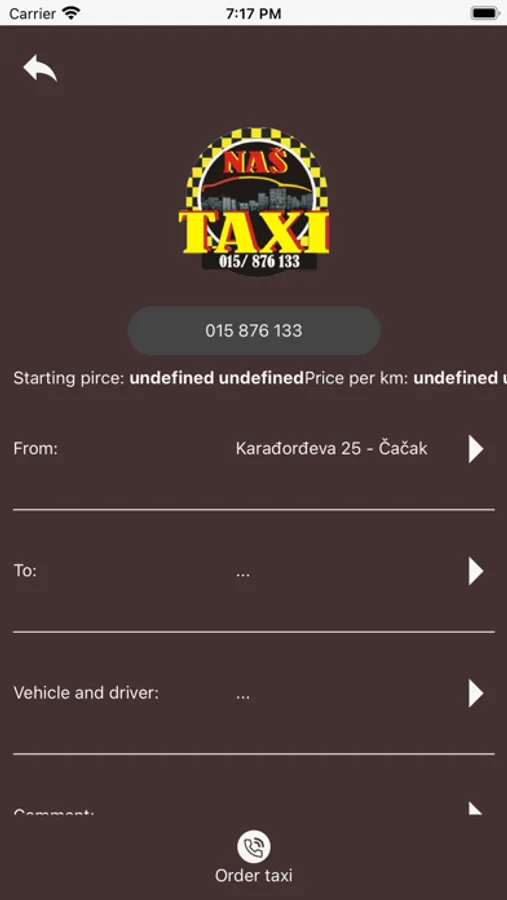 Aplikacija omogućuje naručivanje najbližeg taksi vozila uz mogućnost pregleda cene vožnje pre potvrde narudžbe. Program radi na Engleskoim i Srpskom jeziku.