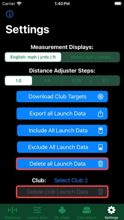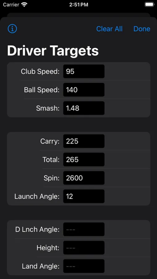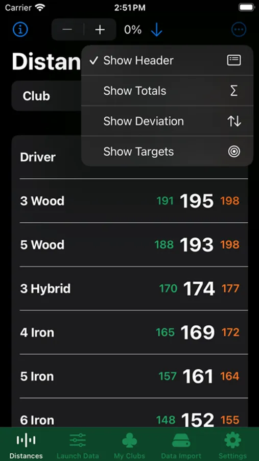 18 Greens is meant to be dynamic. Easily enter, import, export, include, exclude and delete data. Keep your launch data fresh as you work towards your goal of dialing in your swing and generating more consistent clubs distances. Easily enter targets or goals for your clubs and view them with your averaged data.