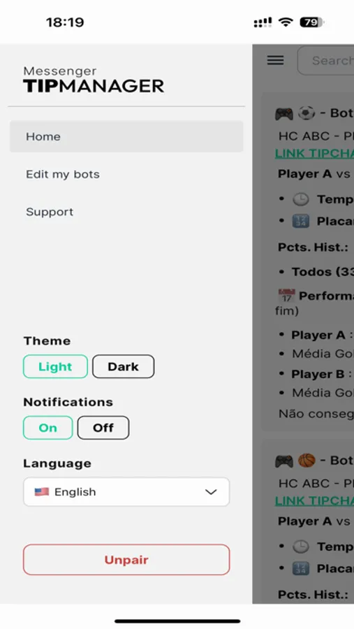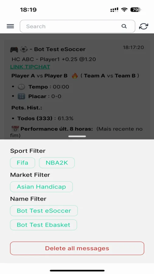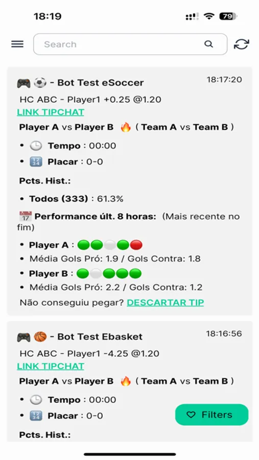 TipChat is an app created to receive your eSoccer, eBasket, Football, and Table Tennis tips directly on your mobile phone! Set up your bot with your filters using TipChat and receive all the signals on your phone, without having to analyze match by match. To connect, simply go to your profile on the TipManager website, use one of the connection keys, and use it to connect.
