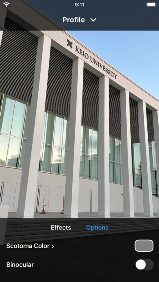 This application simulates symptoms of low vision vision. It can reproduce blur, glare, tunnel vision, central scotoma and nystagmus. It can also simulate complex situations such as glare and tunnel vision at the same time. It allows users to share their low-vision settings and take photos and videos during the simulation. Additionally, it can connect remotely to another device to adjust the effects while previewing the simulation.