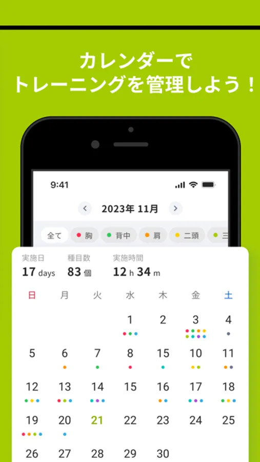 ・日別、週別、月別で見れるトレーニングカレンダー