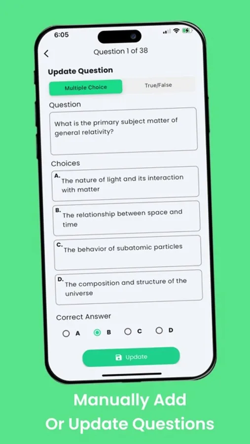 Effortless Quiz Creation: No more time-consuming writing! Our AI analyzes your chosen topic (history, science, literature, languages – anything!) and instantly generates multiple choice and true/false questions.
