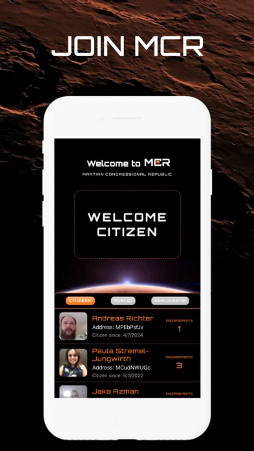 Citizen Registry: Establish your identity on Mars with an on-chain "proof of humanity" system. This peer-based public identity and voter registry leverages HD Marscoin wallets and decentralized IPFS nodes, ensuring your Martian citizenship is recognized and attested.