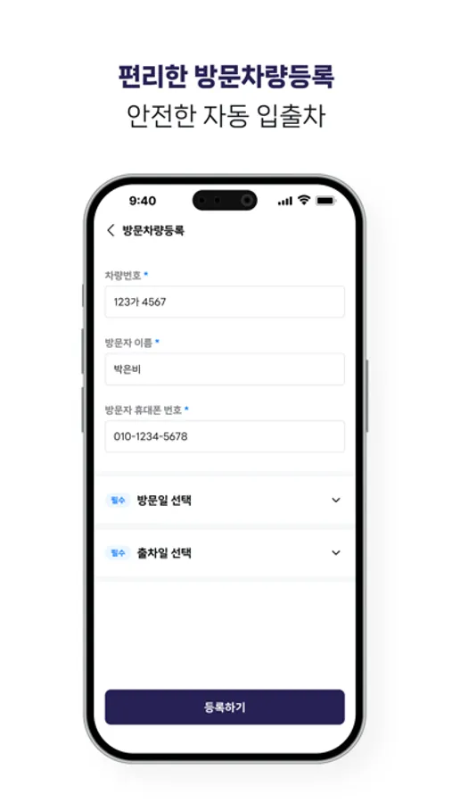 편리한 방문차량등록으로 안전하고 간편하게 외부 손님을 초대해요.