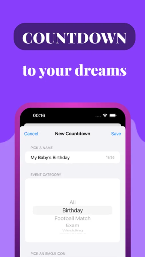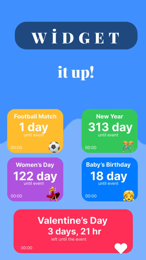 Ultimate Customization: Personalize your countdowns with vibrant colors, stunning images, and custom event icons. Make each countdown reflect the significance of your special moment.