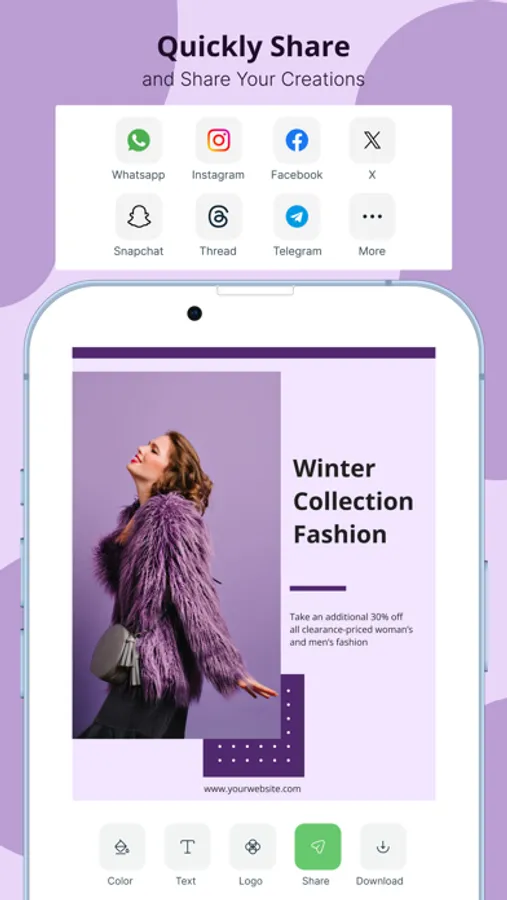 Social Media Ready: Seamlessly share your creations on social media platforms directly from the app. Optimize your posts for different platforms with preset dimensions and layouts.