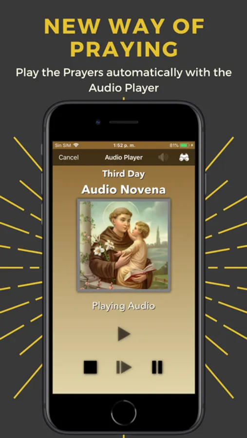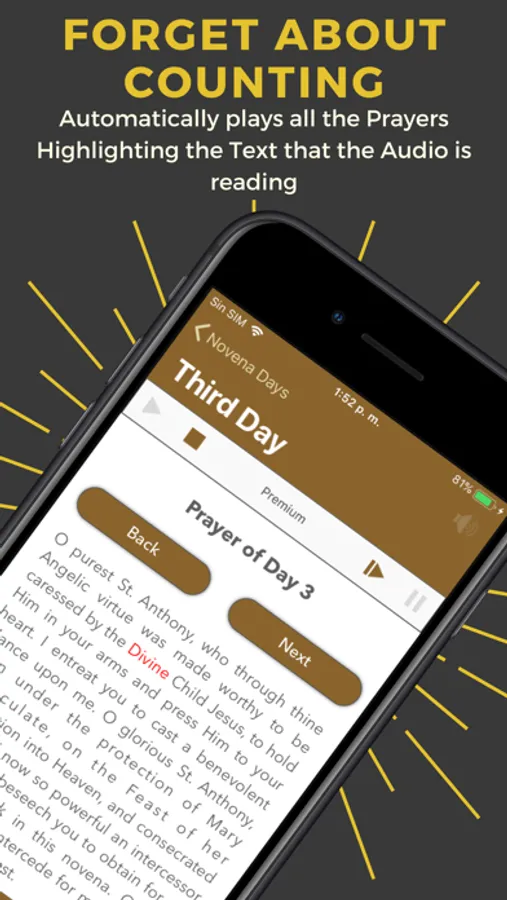 - Automatically plays the Novena, Chaplet, Tredecina or the 13 Tuesdays, Highlighting the Text that the Audio is reading.